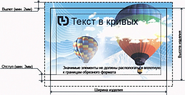 - Вынос за обрезной формат (bleed) должен быть одинаков со всех сторон и составлять не менее 2 мм с каждой стороны. Значимые элементы не должны размещаться вплотную к границам обрезного формата, т.к. при резке допускается небольшое отклонение в обе Pin-Up